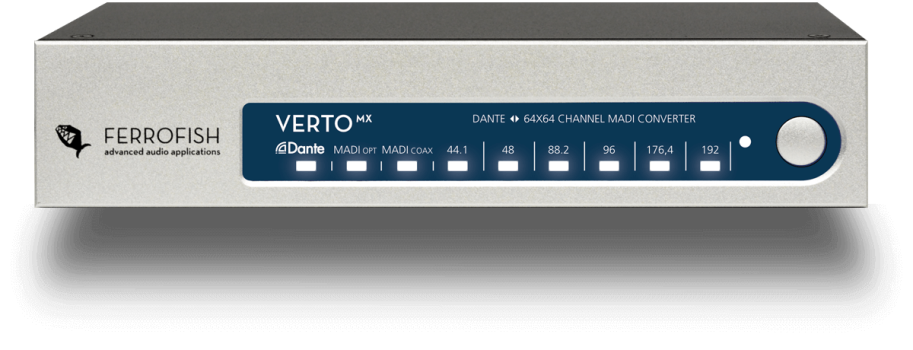 The Ferrofish Verto MX makes it easy to integrate your existing MADI equipment into a Dante audio network with true plug-and-play simplicity. Whether you’re connecting a MADI mixer or converter, the Verto MX instantly makes all 64 x 64 MADI channels available on your Dante network. Compact and reliable, it features both optical and coaxial MADI interfaces, allowing flexible setup with a wide range of professional gear. In case of a signal failure, the system automatically switches to the backup interface for redundant operation and uninterrupted performance.